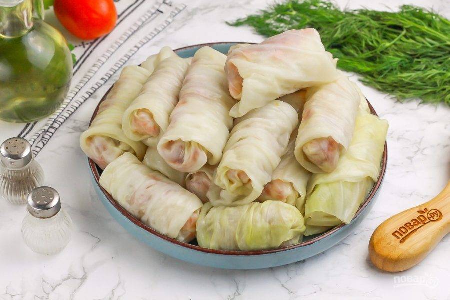 Сверните края, а затем скатайте рулетиком, получая аппетитный голубец. Таким образом скрутите и остальные заготовки.