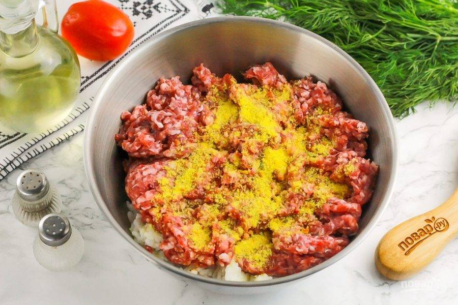 Рис выложите в миску или салатник, добавьте туда же мясной фарш и приправу, соль и молотый черный перец.
