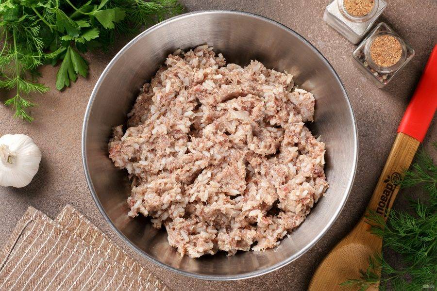Фарш соедините с отваренным до полуготовности рисом и тёртой на крупной тёрке луковицей, посолите и поперчите по вкусу. Тщательно перемешайте.