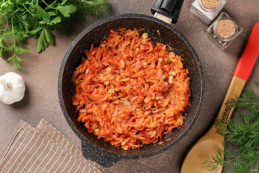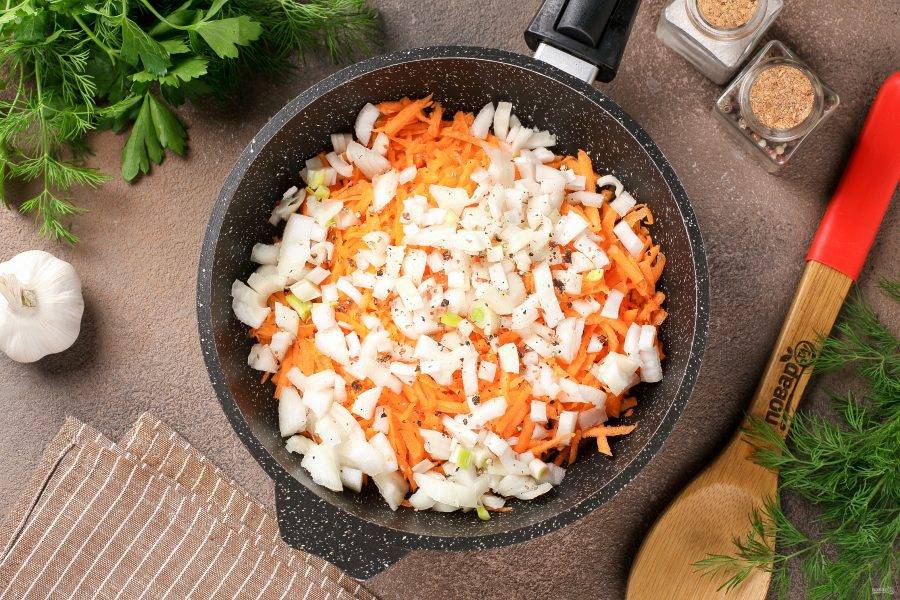 Разогрейте сковороду с маслом, выложите нарезанный кубикам лук и тёртую морковь.