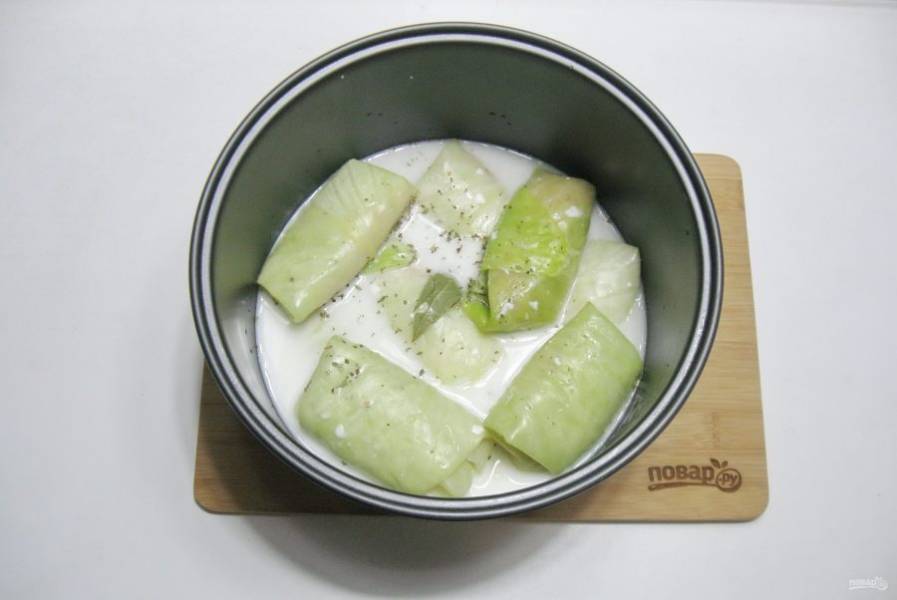 Закройте кастрюлю крышкой и установите в мультиварке режим "Тушение". Готовьте голубцы 50 минут.