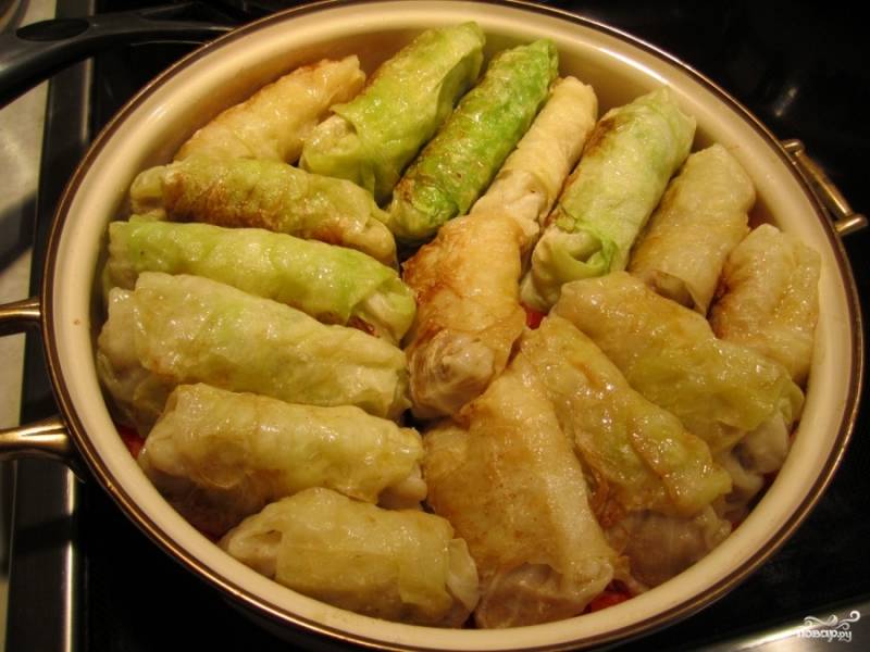 Возьмите широкую кастрюльку. Выложите 1-ый слой лука, 2-ой - нарезанные кубиками помидоры, добавьте соль и красный перец, по вкусу. Выложите поверх обжаренные голубцы.