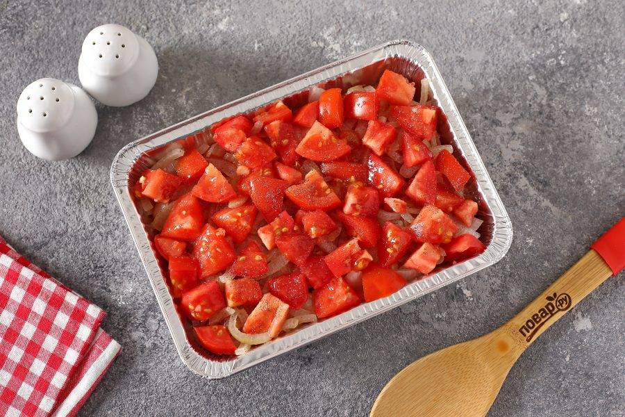 Затем выложите обжаренный лук и помидоры, нарезанные кубиками. Посолите слой и поперчите по вкусу.