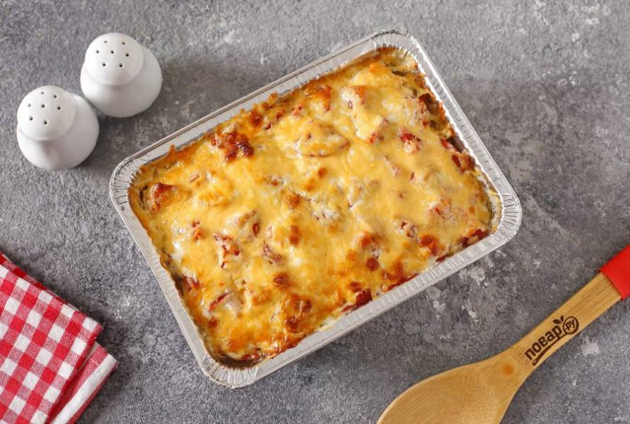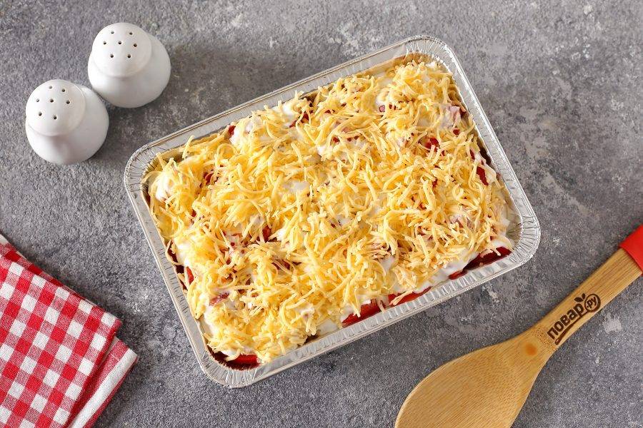 Соедините сметану с майонезом и полейте все сверху готовым соусом. Затем посыпьте верх тертым сыром. Запекайте в духовке при температуре 180 градусов в течение 30 минут.
