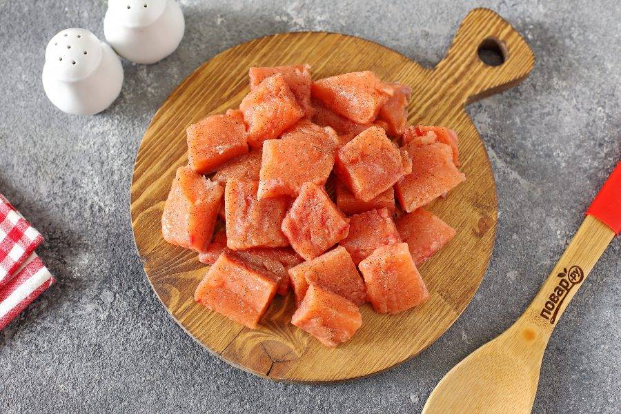 Горбушу разделайте на филе и нарежьте небольшими кусочками. Посолите и поперчите филе по вкусу.