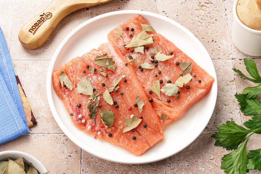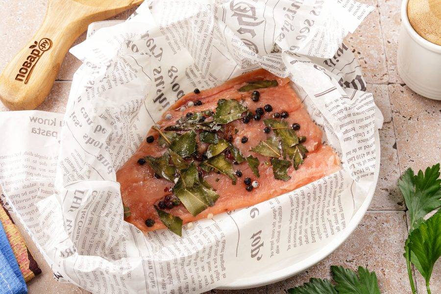 На каждый пласт рыбы выложите горошины чёрного перца и измельчённые листочки лаврушки.