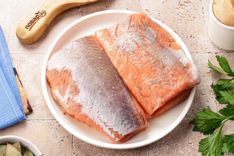 Разрежьте рыбу на 2-3 пласта, в зависимости от размера, а затем каждый пласт разделите на две половины. Удалите хребет, крупные кости и плавники. Шкурку я аккуратно снимаю, но можете оставить. В таком случае тщательно поскоблите тушку предварительно ножом, счищая чешую, а затем промойте. Измерьте вес рыбы, у меня получился 1 кг. подготовленного филе.
