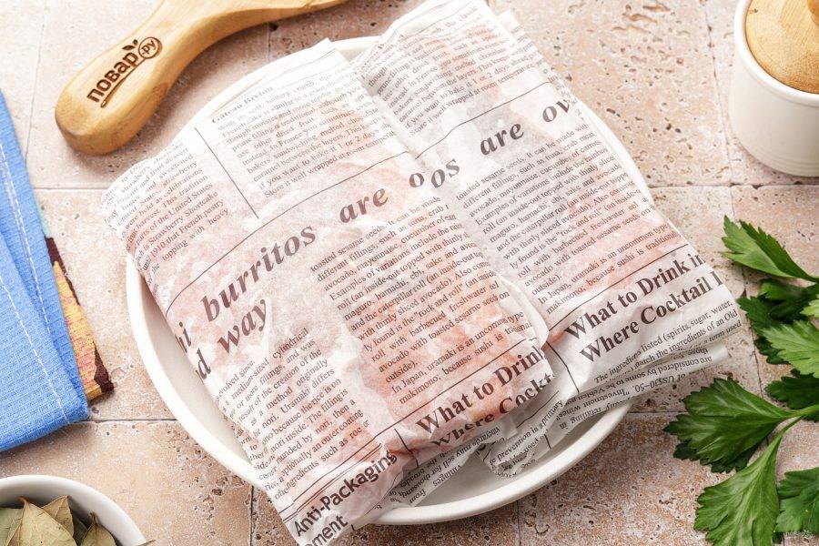Заверните куски в пергамент или в чистое полотенце и уберите в холодильник на сутки, можно оставить и на пару дней.