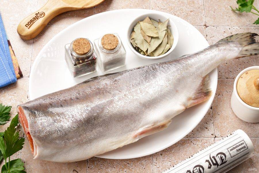 Подготовьте все ингредиенты. Если у вас рыба замороженная, предварительно разморозьте её, но не до конца. Так вам легче будет её разделывать. Голову и хвост я оставила для ухи. Рыбу тщательно промойте и выпотрошите, если необходимо. Если вы будете использовать голову, например, для ухи, то её также хорошо очистите и удалите жабры.