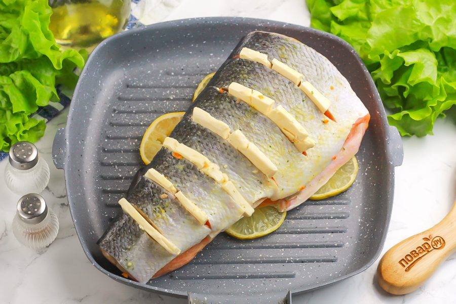 Нарежьте лимоны кружочками и выложите в форму либо замените их ломтиками картофеля. Эта "подушка" делается для того, чтобы рыбка не пристала кожей к форме в процессе выпекания. Выложите горбушу на лимоны и сбрызните растительным маслом. Отправьте в разогретую до 180 градусов духовку на 25-30 минут, но на нижнем ярусе, чтобы сыр не подгорел.