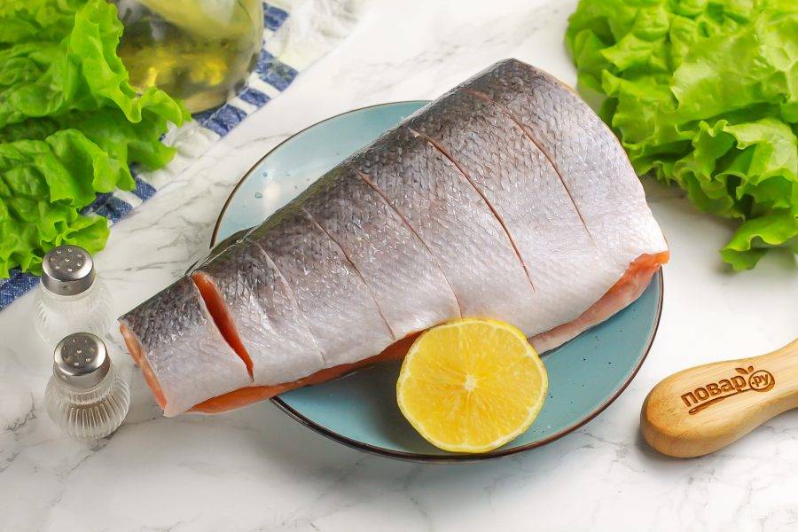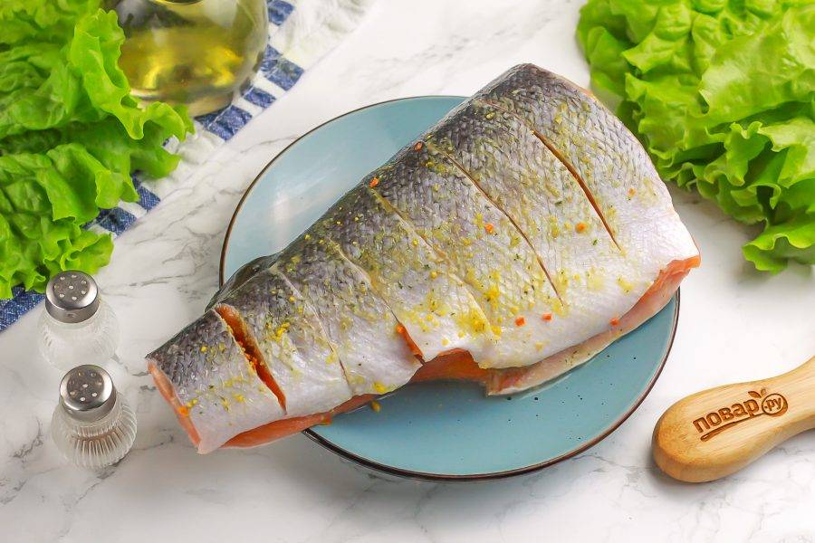 В очищенной тушке сделайте продольные разрезы. Выжмите из четверти лимона сок и натрите им тушку рыбы, вливая его и в разрезы.