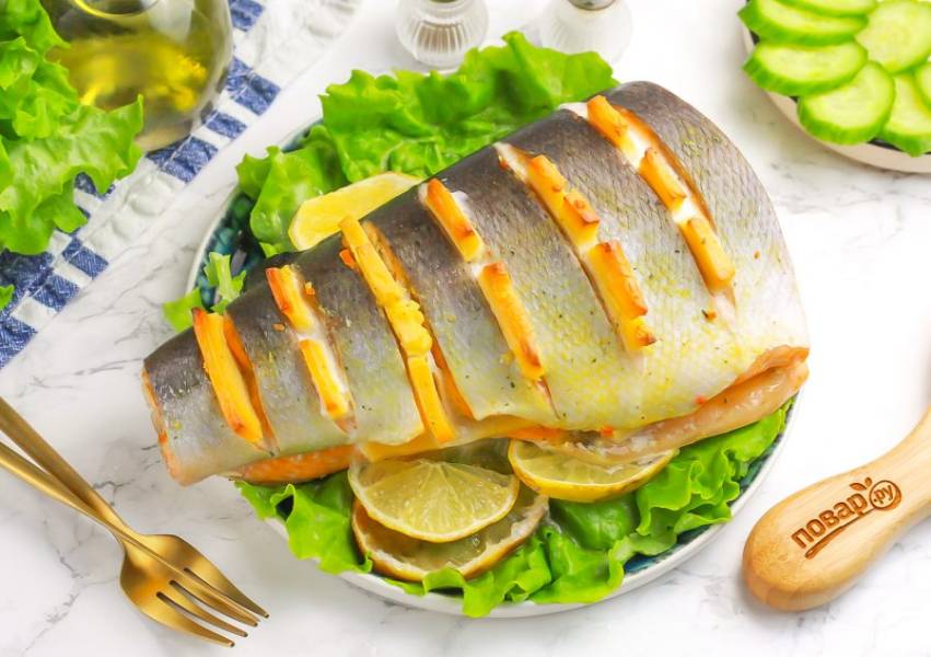 Выложите запеченную горбушу со сливочным сыром на тарелку и подайте к столу горячей. Приятного вам аппетита!