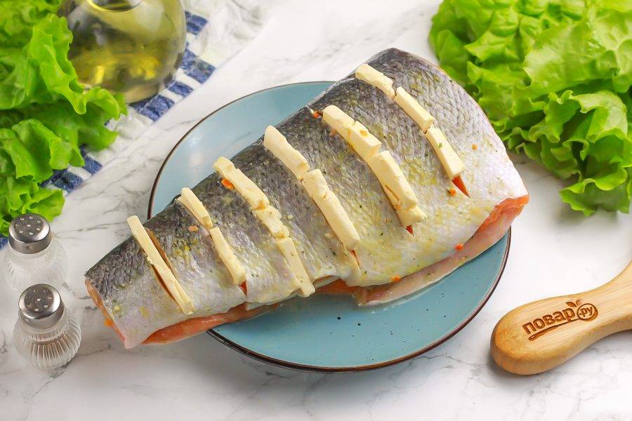 Нарежьте плотный сливочный сыр и выложите его в разрезы на тушке.