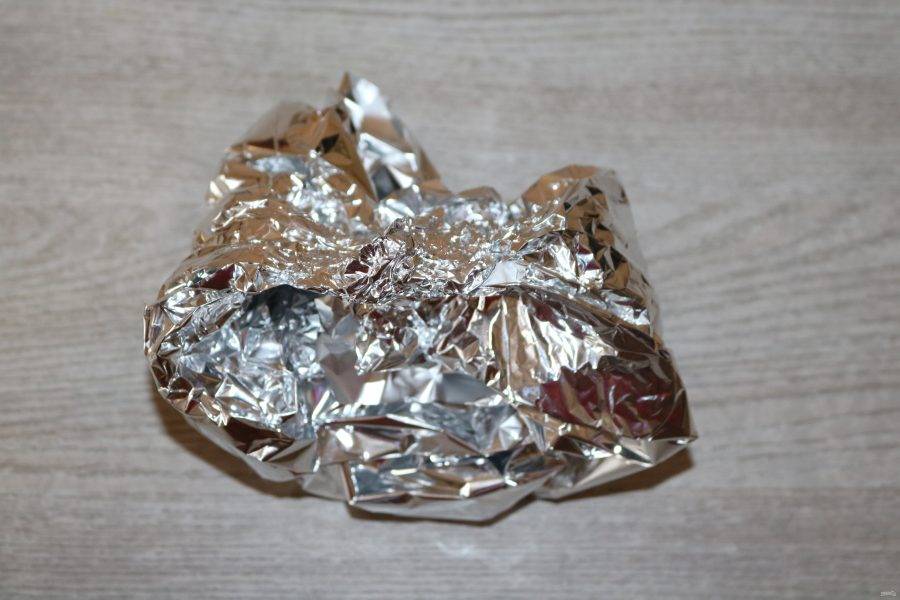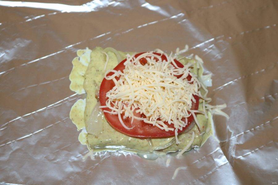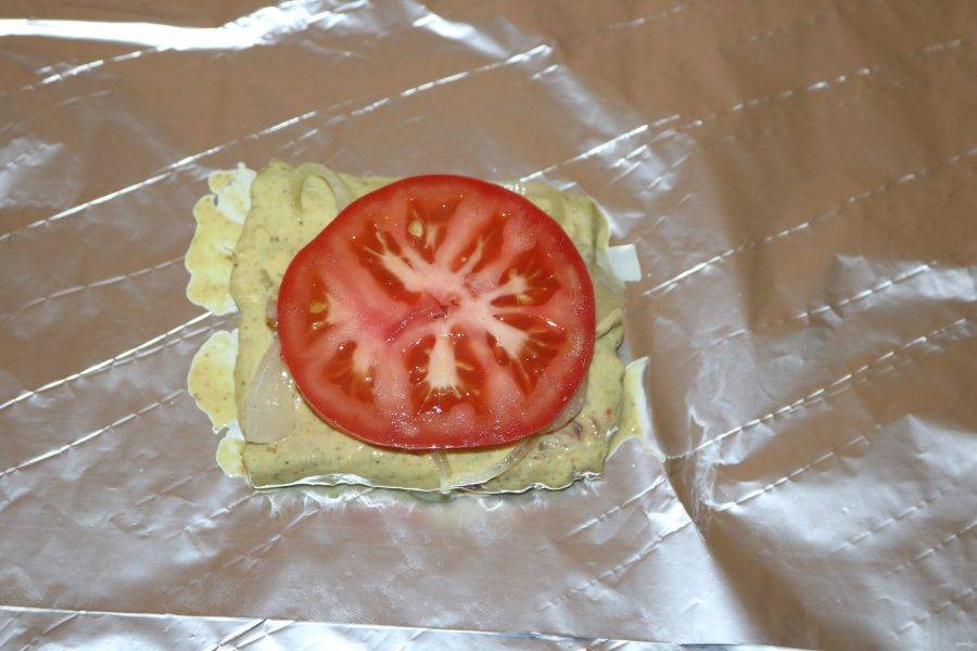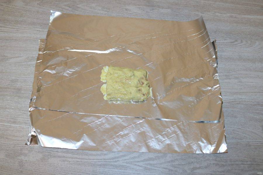 Кусок фольги сложите вдвое. Дно смажьте растительным маслом и положите кусок рыбы. Налейте на рыбу соус, в котором горбуша мариновалась.