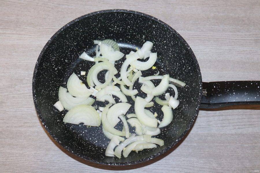 Лук нарежьте полукольцами, обжарьте на разогретой сковороде с добавлением небольшого количества масла.