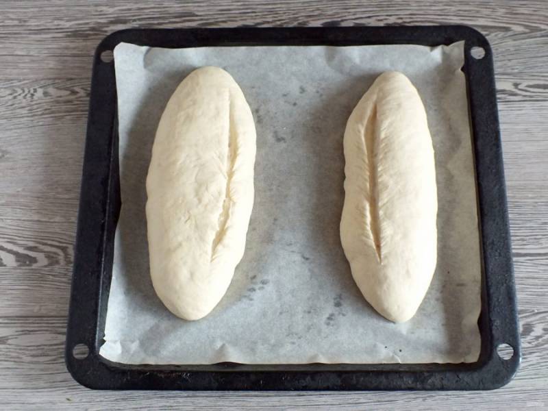 Когда булочки расстоятся, чуть пониже середины, сделайте острым ножом или лезвием разрез. Поставьте выпекаться в разогретую до 180 градусов духовку на 20-25 минут. Учитывайте особенности своей духовки!