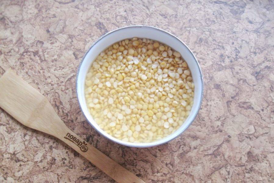 Сухой горох тщательно помойте и залейте холодной кипяченой водой. Дайте набухнуть в течение нескольких часов. Я это делаю на ночь.