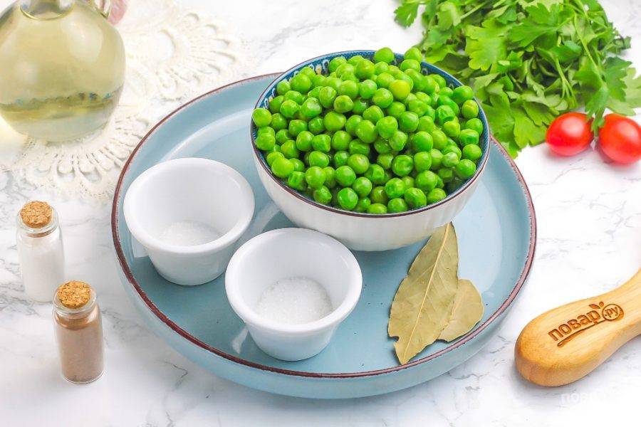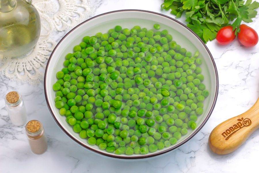 Подготовьте указанные продукты. Горошек очистите в миску или салатник, если приобретали его в стручках.
