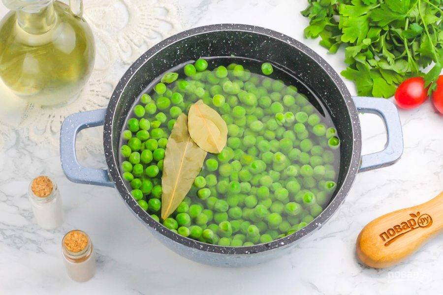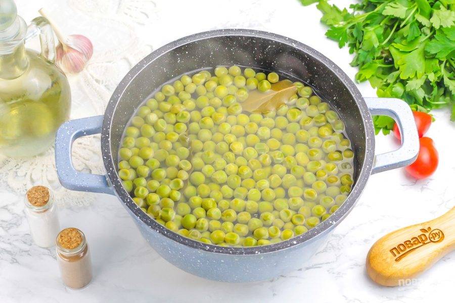 Влейте кипяток и поместите емкость на плиту. Доведите жидкость в емкости до кипения, убавьте нагрев до среднего и отварите горошек в течение 15-20 минут. Чем "старше" и плотнее горошек по вкусу, тем дольше его нужно варить.