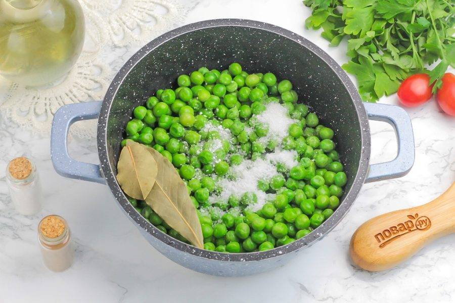 Воду слейте, пересыпьте горошек в кастрюлю или казан, ковш. Добавьте сахар, соль и лимонную кислоту, лавровые листья. Кстати, кислоту или уксус добавлять нужно обязательно не только потому, что они — консерванты. Благодаря кислоте горошек приобретет аппетитный цвет.