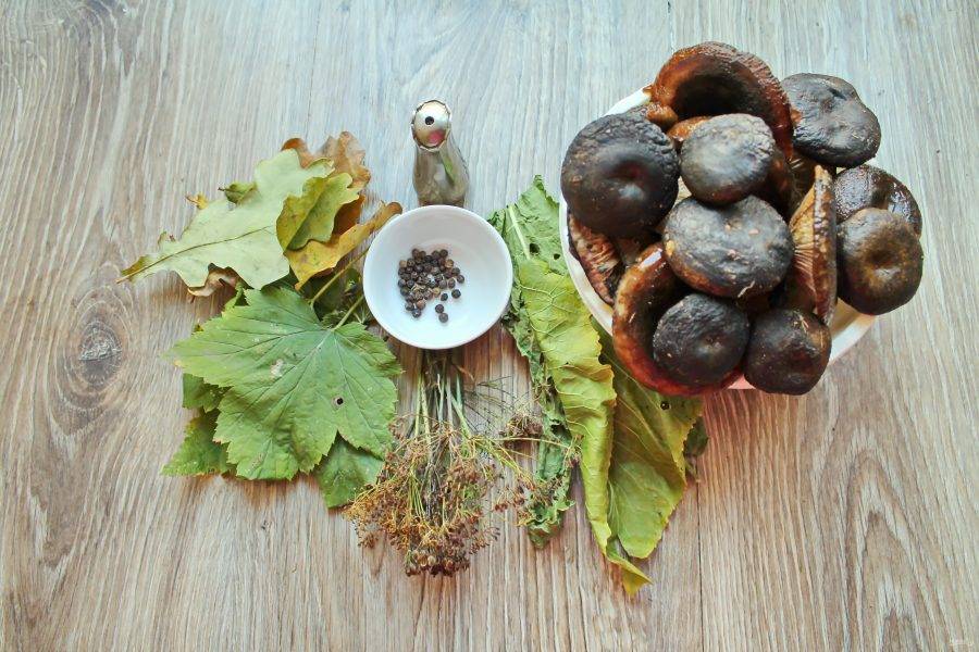 Подготовьте все необходимые ингредиенты для приготовления груздей засоленных горячим способом. Грибы переберите, почистите, удалите червивые и порченные.