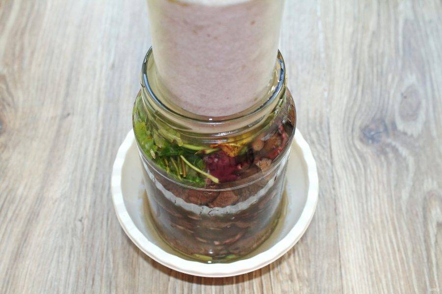 Установите сверху груз и оставьте при комнатной температуре в течение 4 дней. Затем закройте банки капроновыми крышками и уберите в холодное, темное место на 40 дней.