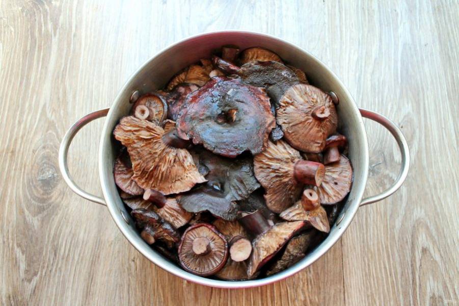 Вымачивайте грузди в холодной воде в течение 3 дней, меняя воду 2-3 раза в день. Затем промойте грибы и выложите их в кастрюлю с толстым дном.