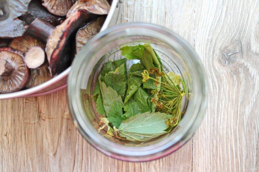 Банки вымойте в горячей воде с содой и тщательно сполосните. На дно банки выложите часть листьев дуба, смородины, хрена, укроп.