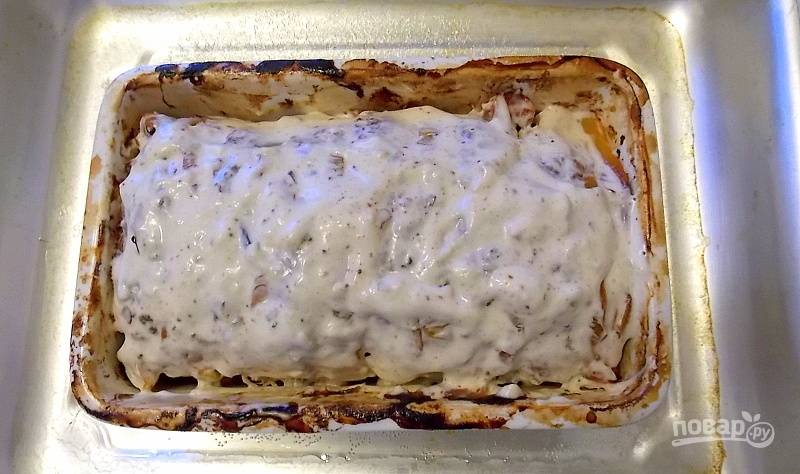 Запекайте в горячей духовке при t=180 на 35 минут. Смешайте до однородности майонез, молоко, тертый чеснок и специи. Выньте форму из духовки, залейте верх смесью.