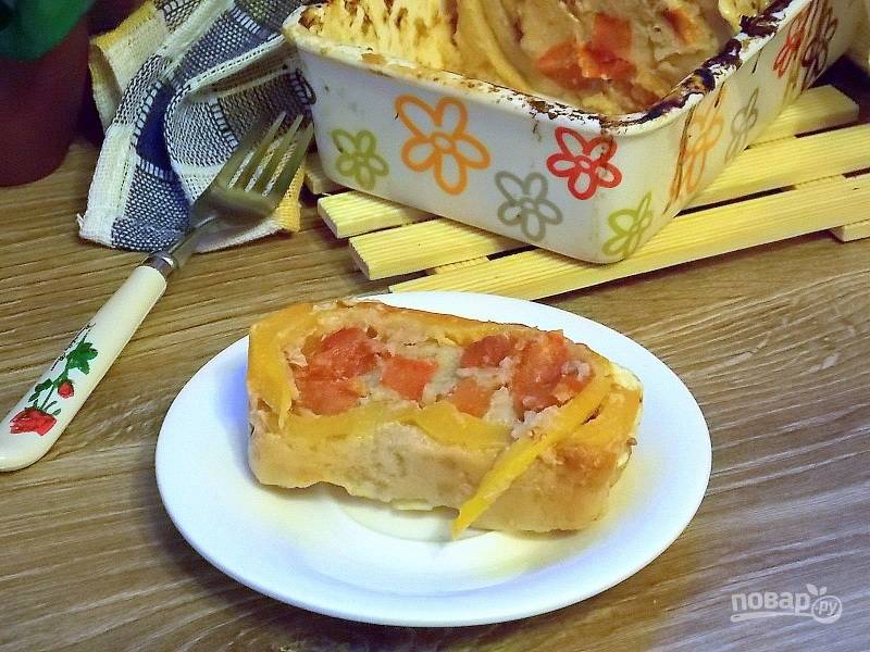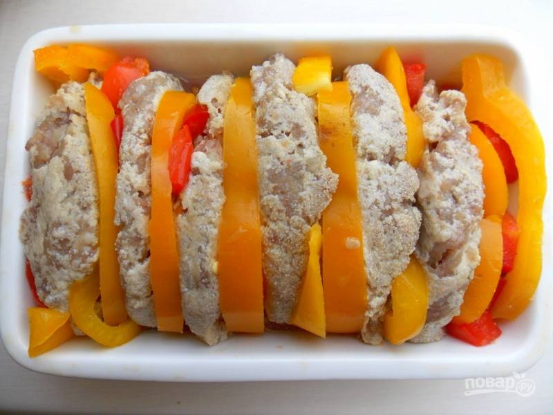 Нарежьте помидору кубиком. В смазанную форму сложите попеременно перец с помидором и котлеты.