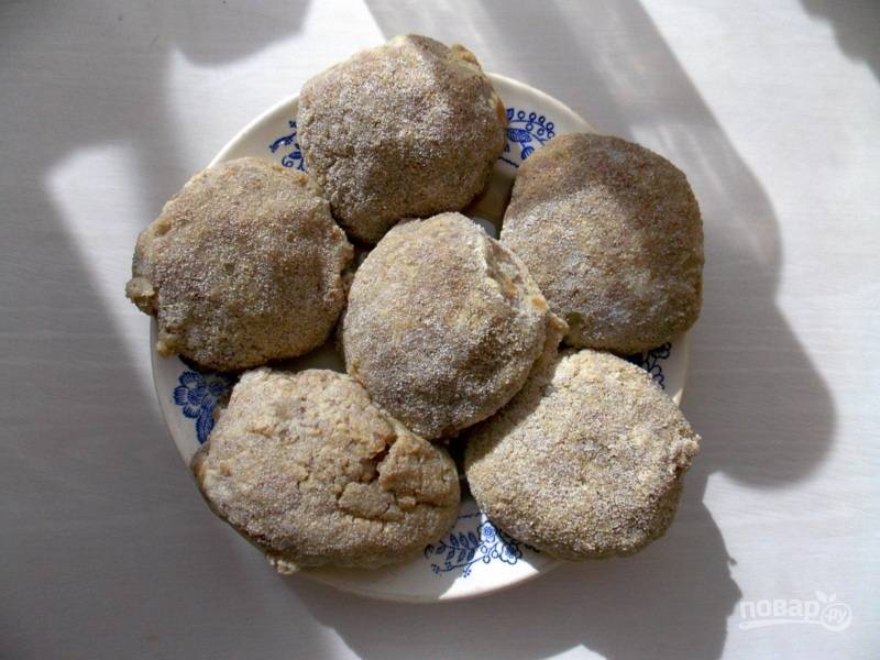 Добавьте в фарш яйцо, специи, мелко нарубленный лук и соль. Перемешайте до однородной массы и сформируйте сырыми руками котлетки. Обваляйте их в манке.