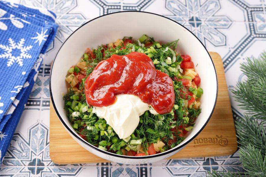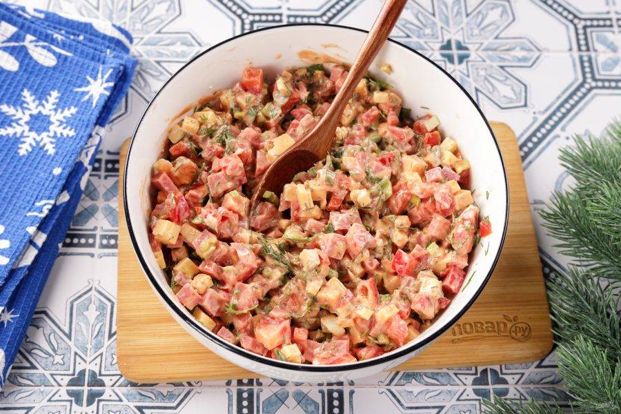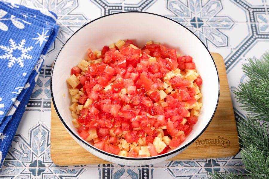 Помидоры вместе с мякотью нарежьте аналогично и добавьте к остальным ингредиентам.