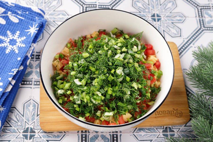 Добавьте любую рубленую свежую зелень, у меня сегодня укроп и перья лука.