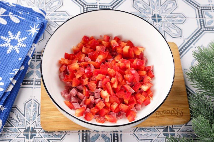 Добавьте нарезанный кубиками болгарский перец, удалив семена.