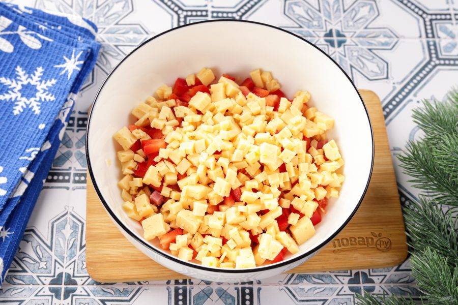 Сыр можно натереть на тёрке или нарезать примерно такими же кубиками.