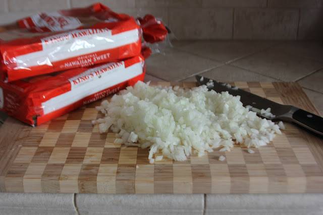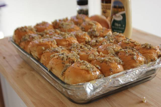 Накройте ветчину разделенными напополам маленькими булочками, сверху распределить оставшийся лук. Накройте фольгой и запекайте при 175 градусах 20 минут. В конце приготволения снимите фольгу, чтоб булочки подрумянились.