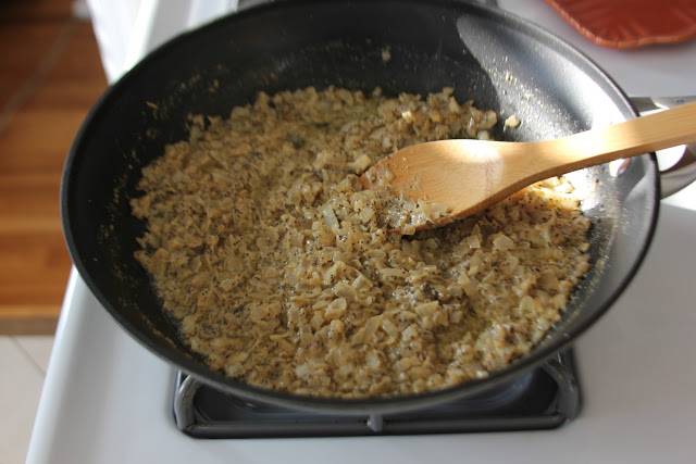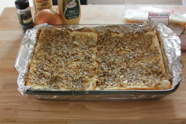 Лук обжарьте до золотистого цвета, добавьте дижонскую горчицу, острый соус, мак.
