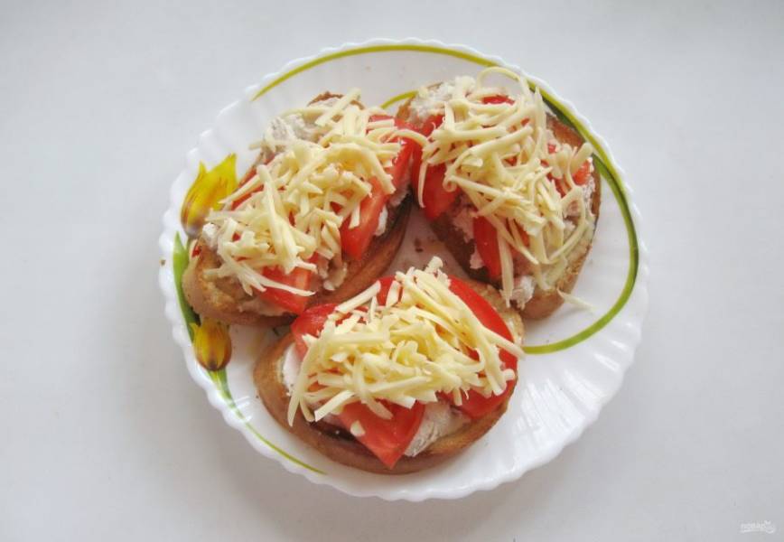 Любой твердый сыр, например "Российский" натрите на терке и выложите сверху на бутерброды.