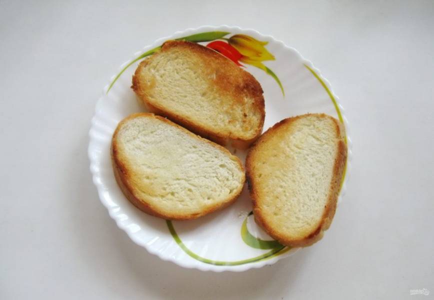 Поджарьте батон с одной стороны до золотистого цвета. Натрите жареную сторону чесноком.