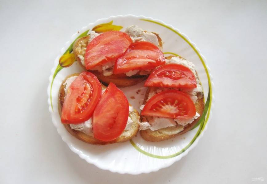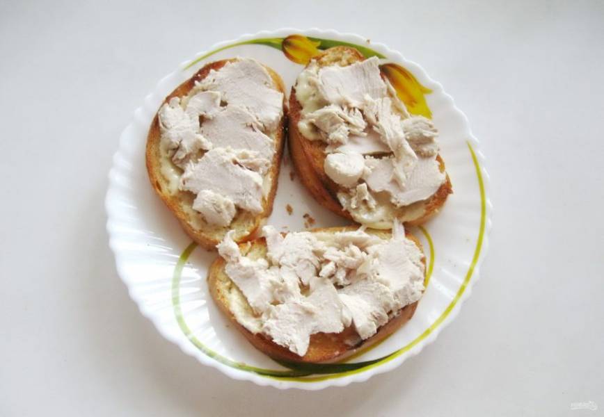 Отварную куриную грудку нарежьте и выложите на ломтики батона.