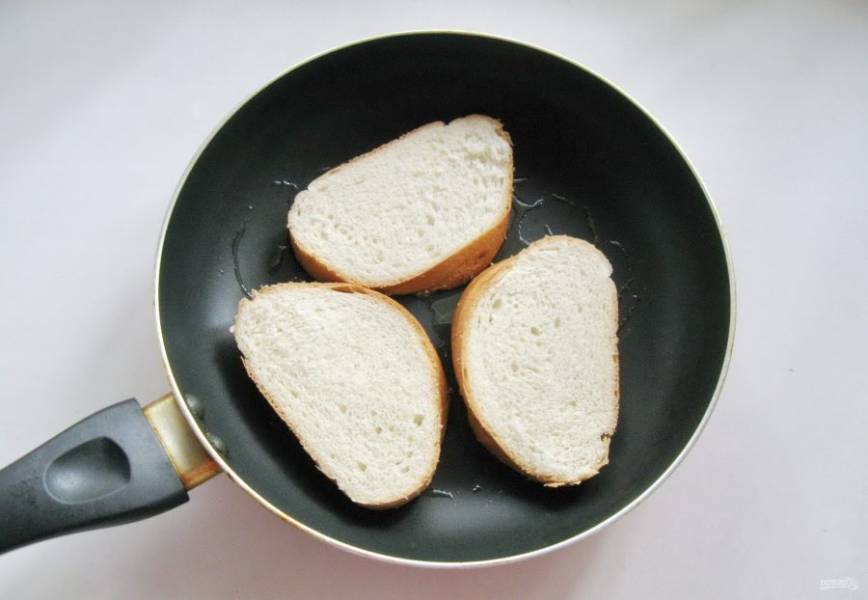 Батон нарежьте ломтиками толщиной 1-1,5 см. Выложите на горячую сковороду с маслом.