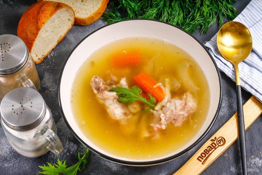 Отварите все в течение 2,5-3 часов на умеренном нагреве до мягкости и разваренности ножек. Объем жидкости при этом уменьшится примерно на треть. Попробуйте бульон на вкус, выключите нагрев.