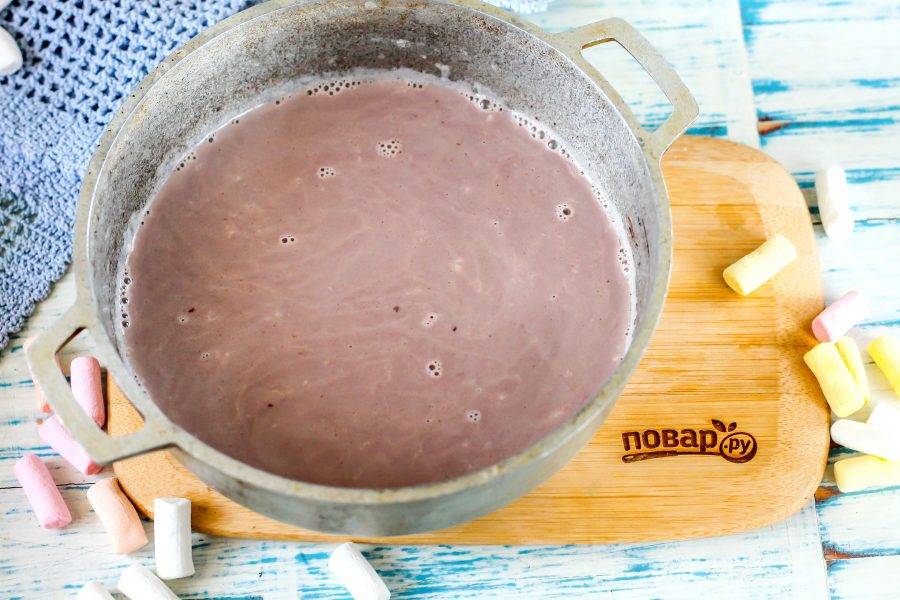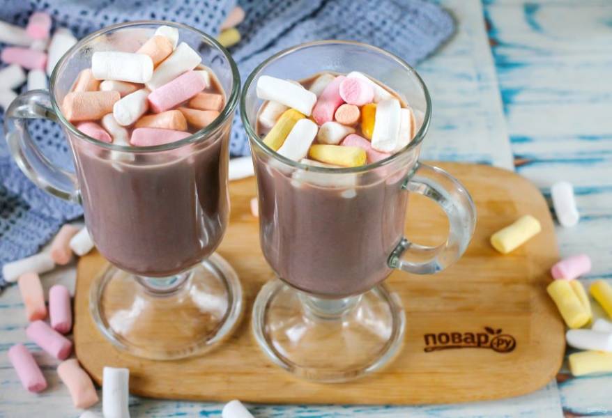 Перелейте шоколад в стаканы или чашки, сверху выложите маршмэллоу.