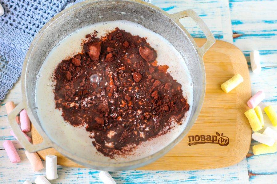 Молоко перелейте в сотейник, ковш или кастрюлю, доведите до кипения. Добавьте сахар и какао-порошок. Помните, что порошок добавляется только в горячую жидкость, иначе в холодной он собьется в комочки.