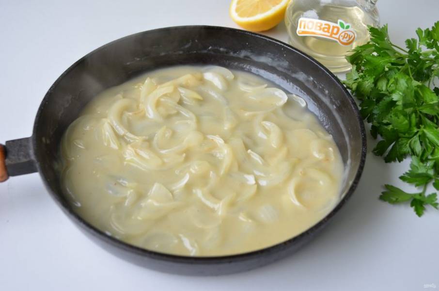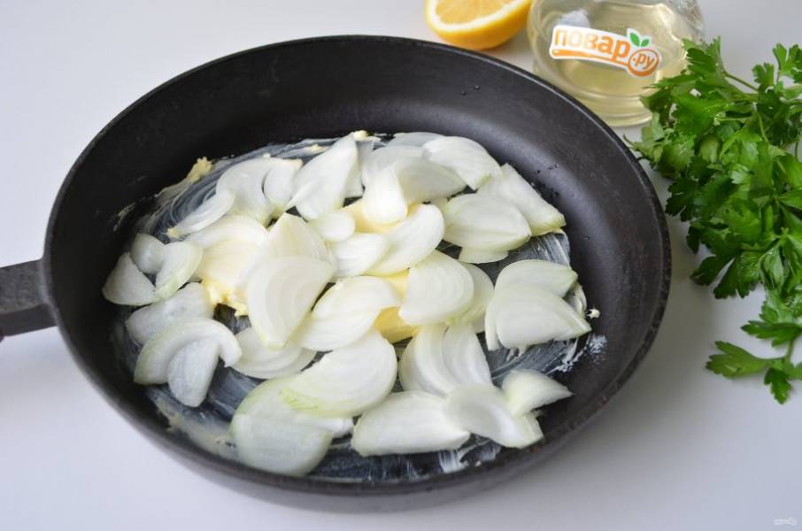 2. Очистите лук, порежьте тонкими полукольцами. На сковороде растопите ложку масла сливочного, обжарьте лук до полуготовности.