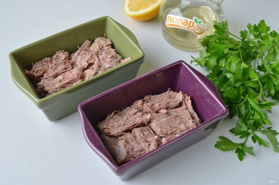 7. Вареную говядину нарежьте тонкими ломтиками и выложите на соус в один слой, можно внахлест.