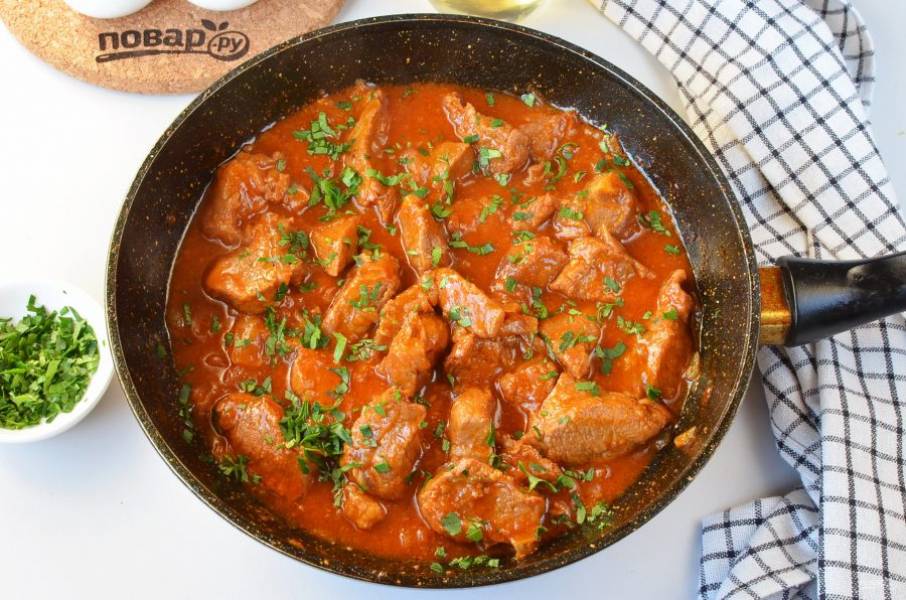 Снимите сковороду с огня, добавьте порезанную зелень и подавайте с любым гарниром.