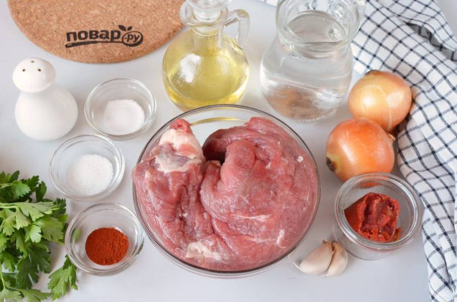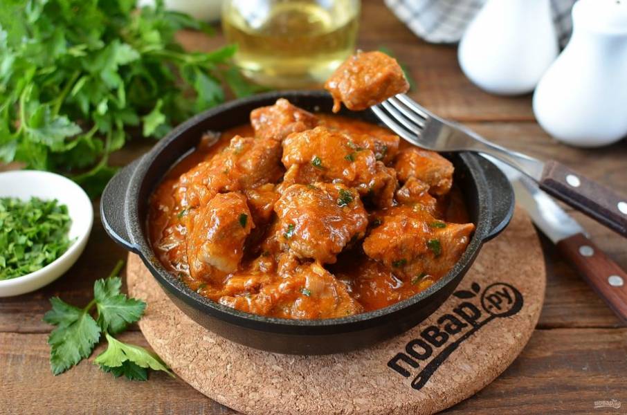 Добавьте томатную пасту и воду. Накройте крышкой и тушите 1 час.