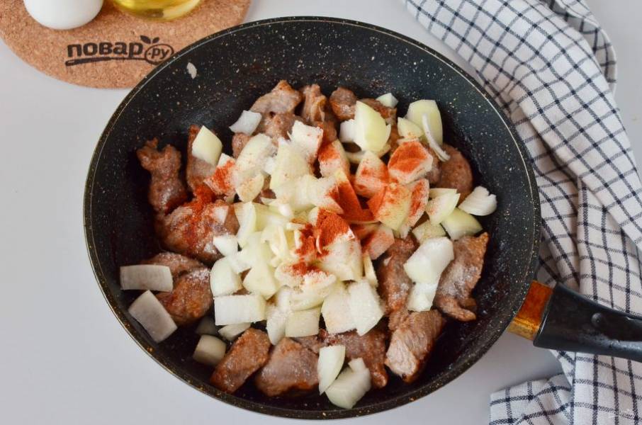 Добавьте сахар, соль, паприку. Обжарьте все вместе пару минут.