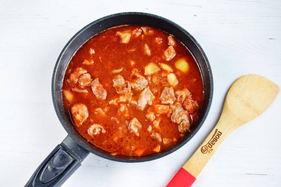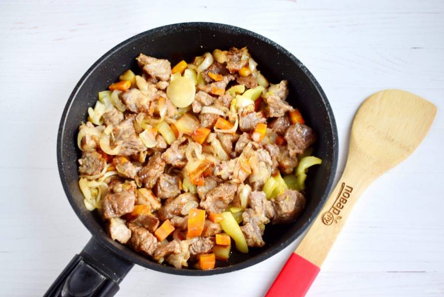 Мясо обваляйте в муке. Добавьте его в сковороду к овощам, обжаривайте до румяной корочки.